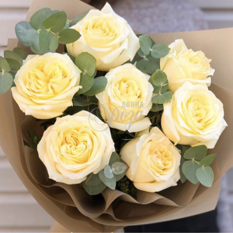 Букет из ароматных пионовидных роз с душистым эвкалиптом взбудоражит чувства и желания вашей получательницы.